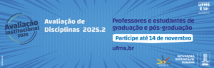 Até 14 de novembro, a Avaliação de Disciplinas do segundo semestre de 2025 estará aberta para professores e estudantes da UFMS. As avaliações, que contribuem para o aprimoramento da Universidade, são feitas de maneira voluntária e anônima.