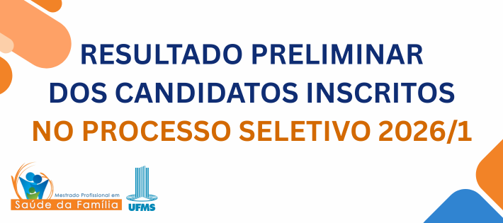 “O PROGRAMA DE PÓS-GRADUAÇÃO EM SAÚDE DA FAMÍLA do Instituto Integrado de Saúde, da Fundação Universidade Federal de Mato Grosso do Sul, por meio da Comissão de Seleção constituída pela Portaria nº 88/2025 – INISA/UFMS, no uso de suas atribuições legais, e de acordo com o Edital nº 352/2025 – PROPP/UFMS, que tornou pública a abertura de inscrições para processo seletivo de candidatos brasileiros e estrangeiros para preenchimento de vagas nos cursos de mestrado e doutorado dos Programas de Pós-Graduação Stricto Sensu (PPGs) da UFMS, para ingresso no primeiro semestre do ano letivo de 2026, e considerando o Cronograma previsto no item 3 do Edital nº 352/2025 – PROPP/UFMS torna público o resultado preliminar dos candidatos inscritos…”